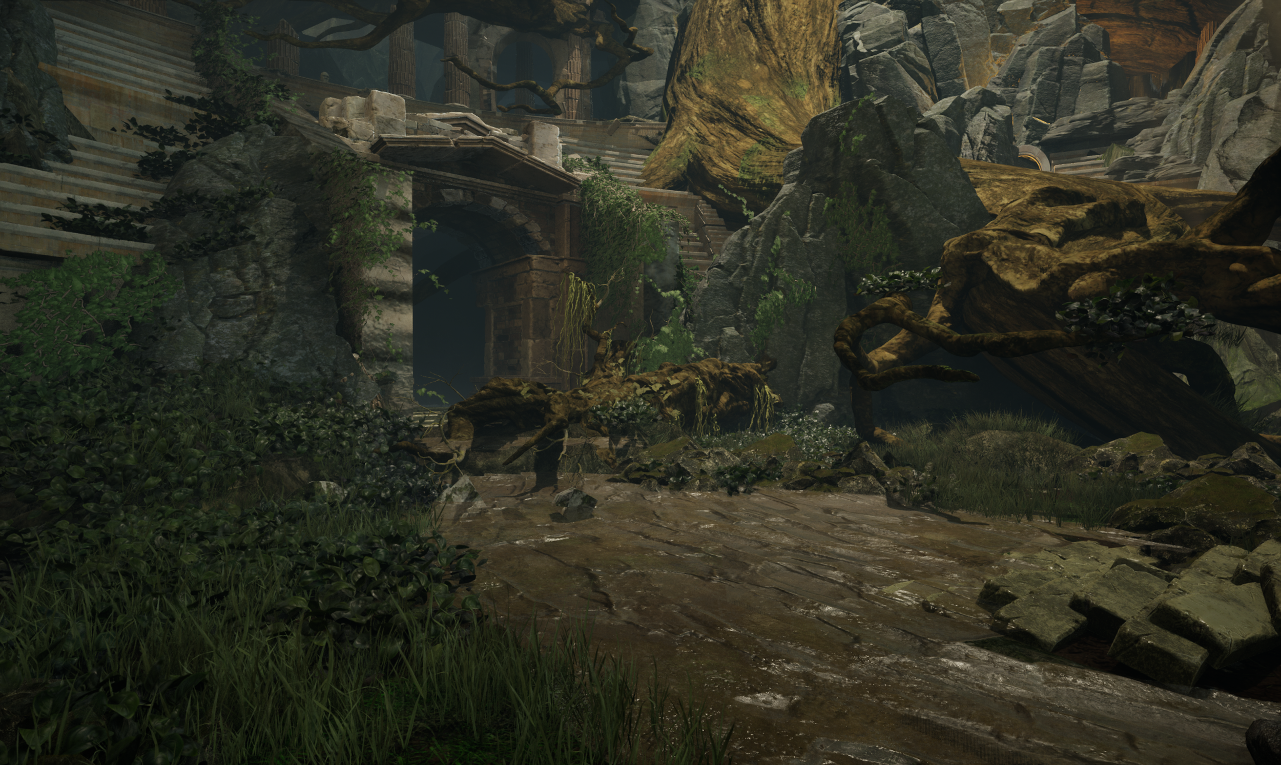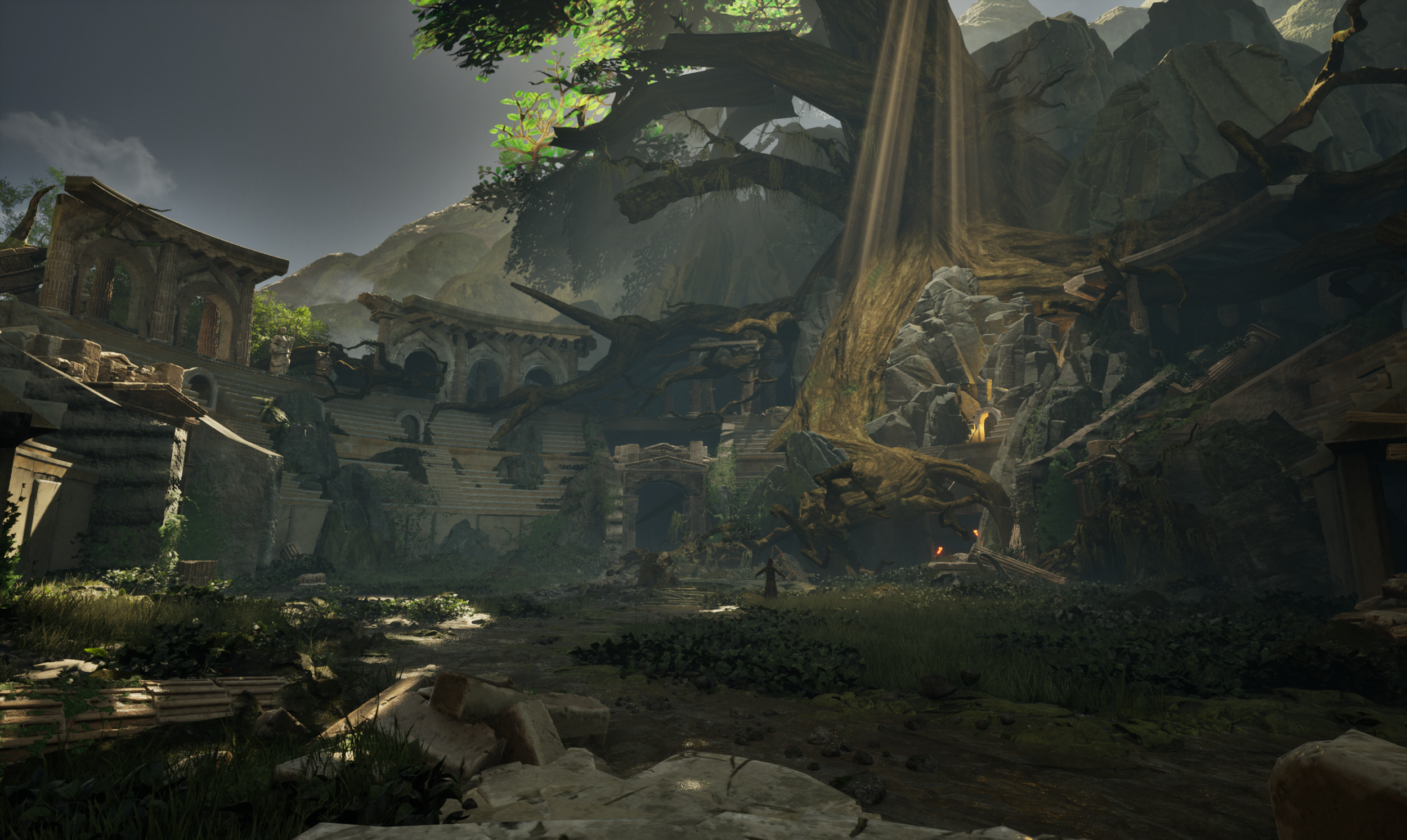 The lighting here is exceptionally bright, with sunlight streaming through the canopy in strong beams, casting overlapping tree shadows on the ground, which gives the space a lively and dynamic feel. The air carries a slight moisture and the scent of fallen leaves, while rays of light occasionally reflect off the stone pillars, lending the arena an almost ceremonial and solemn atmosphere, signaling that a duel is about to commence.